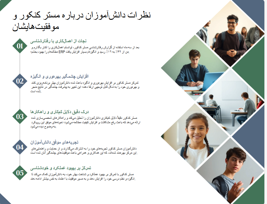 بعد از سه ماه گزارش رفتارشناسی مسترکنکور باعث شد از اهمالکاری نجات پیدا کنم. ERP من از ۴۲٪ به ۷۹٪ رسید.
