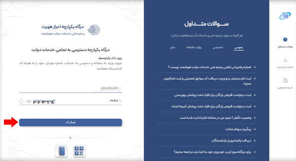 - سپس با وارد نمودن “شماره موبایل” و “کد امنیتی” بر روی “ارسال کد” بزنید تا به صفحه بعد هدایت شوید.