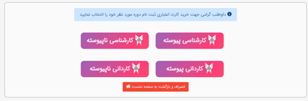 هنگام خرید کارت اعتباری به گروه آزمایشی و مقطع دقت کنید زیرا در صورت خرید کارت اعتباری اشتباه، امکان ویرایش وجود نخواهد داشت.